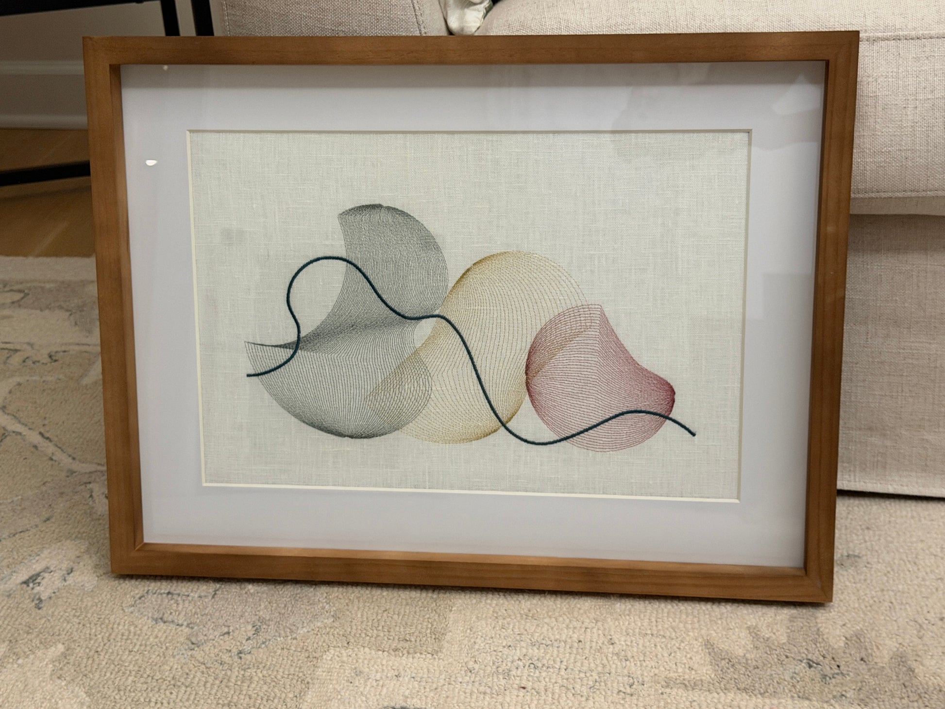 Refined and graceful overlapping perching figures. Embroidery on linen. Mounted in a medium stained wood frame (landscape) and ready to hang. Artwork measures 12 x 18 inches (Outer frame is larger).